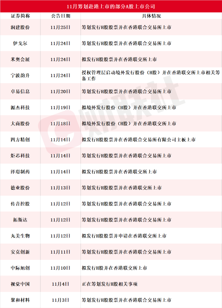 财联社11月30日讯(编辑若宇)A股公司赴港上市热潮持续。据财联社不完全统计,11月包括润建股份、伊戈尔、米奥会展、宁波韵升、卓易信息、源杰科技、大商股份、四方精创、炬芯科技、泽璟制药、德业股份、传音控股、拓斯达、丸美生物、安克创新、中际旭创、视觉中国、聚和材料在内的18家A股上市公司披露筹划赴港上市,详细情况见下图: