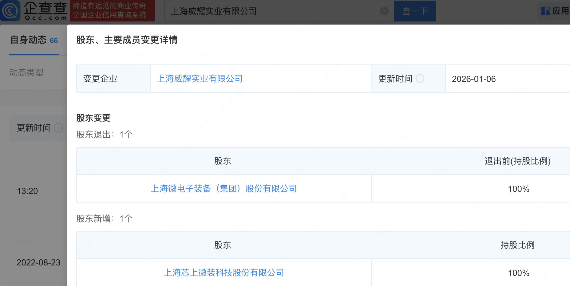 近日,上海威耀实业有限公司发生工商变更,上海微电子装备(集团)股份有限公司退出股东,新增上海芯上微装科技股份有限公司为全资股东,认缴出资额2.285亿。企查查信息显示,该公司成立于2003年,经营范围包含:电脑图文设计、制作,园林绿化,机械设备的安装、维修、保养等。
