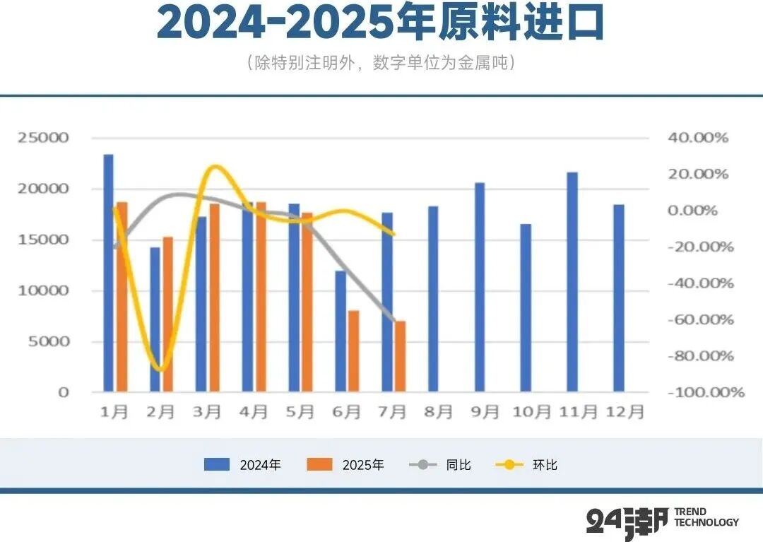另外据海关数据及安泰科测算,2025年7月中国钴原料进口约7053金吨,同比下跌60.12%,环比下跌12.72%。其中钴湿法中间进口约4143金吨,同比减少72.6%,环比下跌27.3%。2025年1-7月中国钴原料进口量约为10.4万金吨,累计同比减少14.69%。