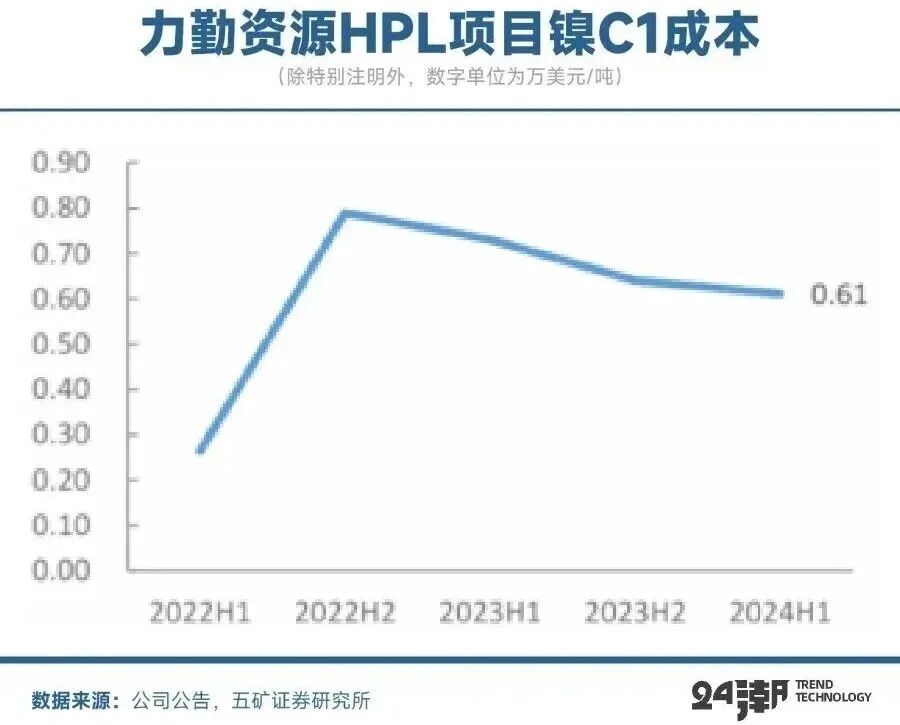 比如根据五矿证券的数据,以力勤资源为例,所用红土镍矿镍钴比10:1,钴营收作为镍成本抵扣,根据Hairita披露的钴金属价格较高的2022年上半年镍C1成本最低达到了0.26万美元/吨,随着钴价回落以及红土镍矿原料价格上涨,2024年上半年抵扣后C1成本达到0.61万美元/吨。