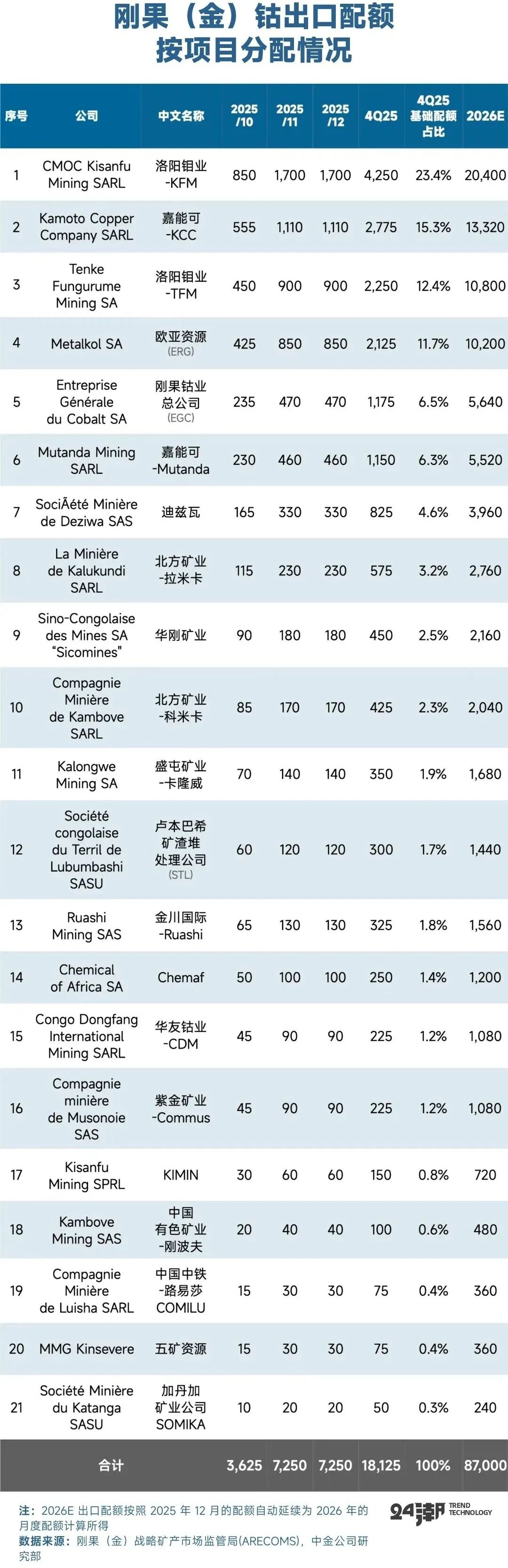 10月11日,刚果(金)战略矿产市场监管局宣布了钴出口配额明细,根据矿企截止2024年底的三年出口情况按比例计算。配额主要分配给矿企以及刚果(金)政府平台。洛阳钼业、嘉能可、欧亚资源等矿企获得主要配额,三者合计占比达62%;EGC、STL、ARECOMS政府平台配额合计占比17%;此外北方矿业、中色集团、中铁资源、盛屯矿业、金川集团、华友钴业、紫金矿业和五矿资源也分别获得了出口配额。所有冶炼厂没有拿到配额,但是未获得配额的企业,可以向ARECOMS提交申请,文件包括:三年出口数据、生产数据、环境和税务证明还有其他要求的文件,给相关企业留下了口子。