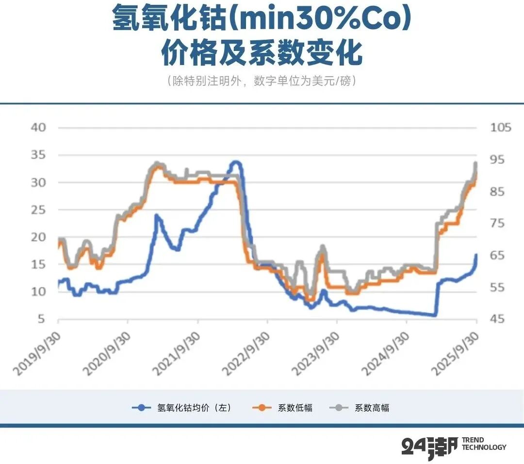 如上图所示,以硫酸钴为代表的钴盐涨幅远高于电钴,主要仍在于钴盐冶炼企业主要采用粗制氢氧化钴等中间品为原料,受钴中间品价格涨幅更大影响,行业成本倒挂进一步加剧。如下图所示,9月钴原料呈加速上涨趋势,截止9月底氢氧化钴(min30%Co)CIF中国报价均价为14.42美元/磅,同比上涨129.62%,环比上涨9.57%;截至9月30日,外盘显示折扣系数(折扣系数本质是氢氧化钴相对于电解钴的品质折价与风险补偿)在91%-93%,受原料稀缺影响,溢价或继续扩大,根据最新的数据显示截止10月中旬,氢氧化钴系数已抬升至95-99%,整个钴市场市场呈现 “面粉比面包贵” 的状态。