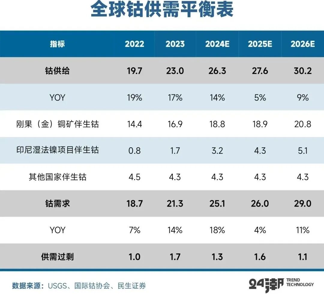 钴价虽然处于历史价格较低区间,但钴的供应却呈现持续增长趋势,根据USGS数据,2024年全球钴产量同比增长21.8%至29万吨,其中,刚果(金)为全球最大产钴国,产量同比增长25.7%至22万吨,占比约75.9%。