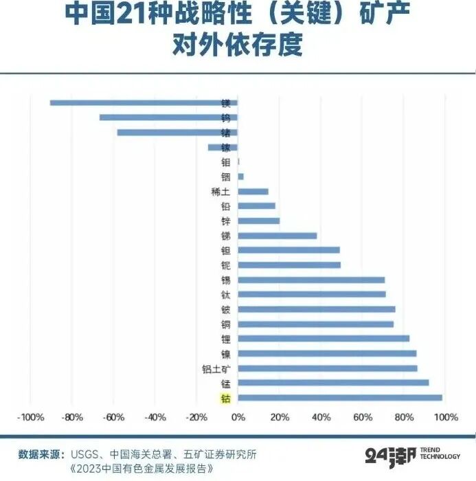 五矿证券数据显示,中国钴矿对外依存度达98.41%。