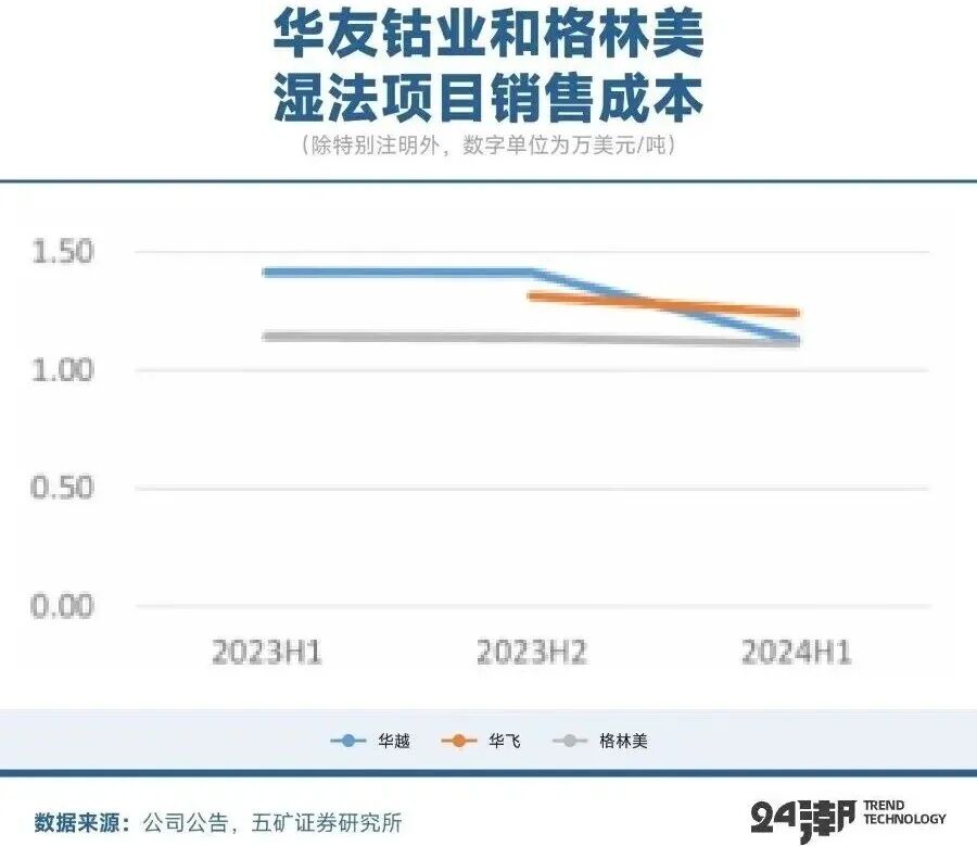 五矿证券根据公司披露业绩倒算,华越项目2023年上半年销售成本约1.4万美元/吨,2024年上半年降至1.13万美元/吨;华飞项目2023年刚投产,2023年下半年成本1.31万美元/吨,2024年降至1.24万美元/吨。格林美湿法项目成本维持在1.1万美元/吨附近。