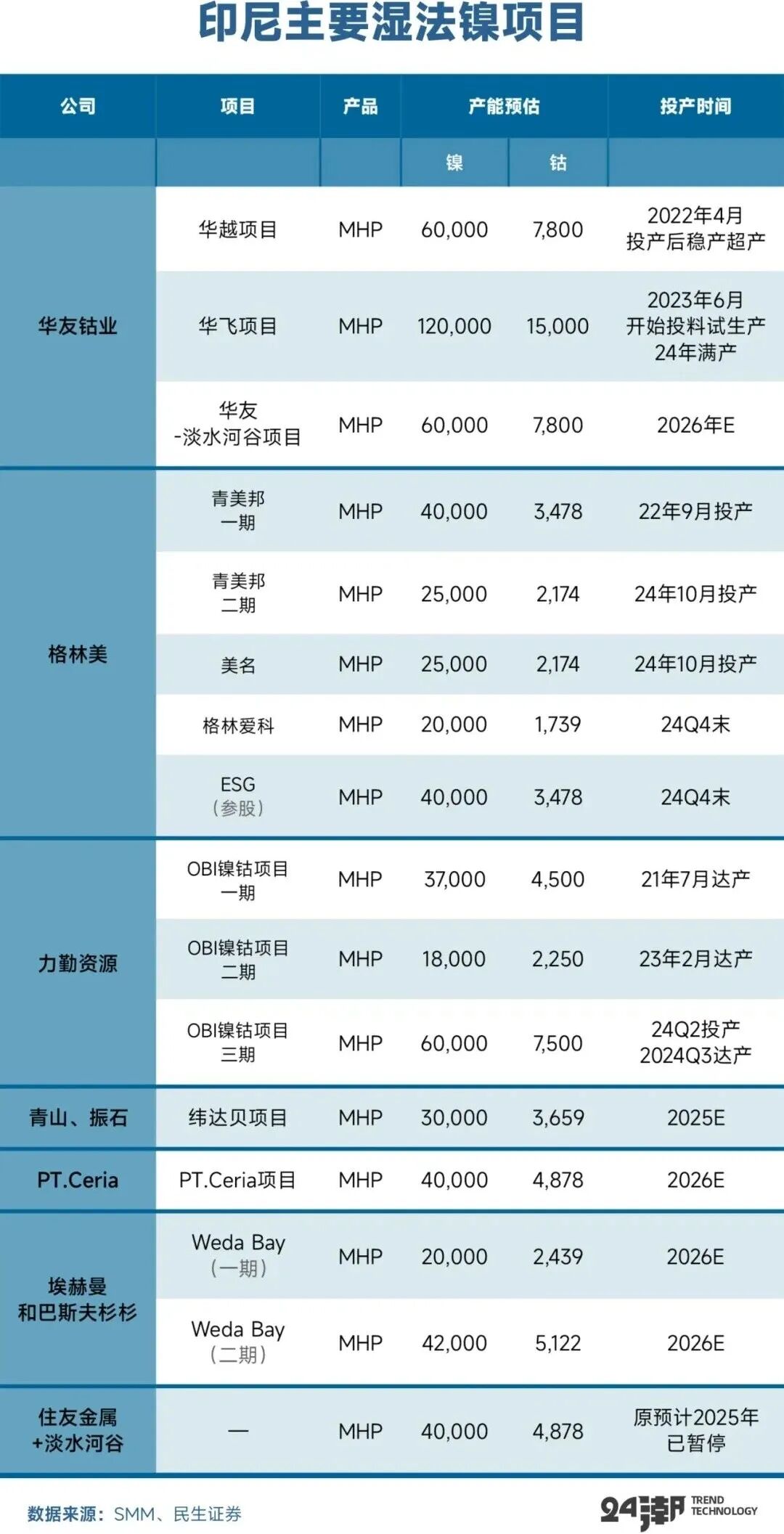 此外,2024年9月,力勤资源HPAL湿法三期ONC项合计3条生产线,总计年设计产能为6.5万金属吨MHP(镍钴化合物)达产,加上公司湿法一期二期5.5万吨产能,公司湿法合计产能达12万吨。